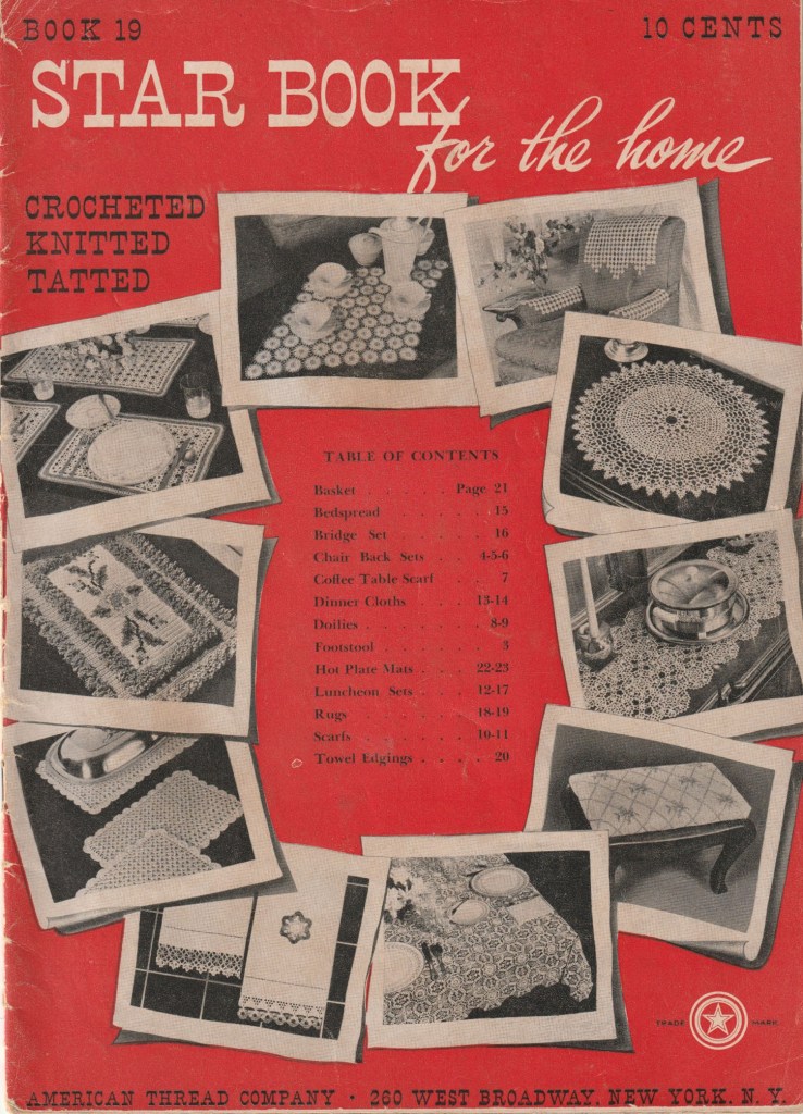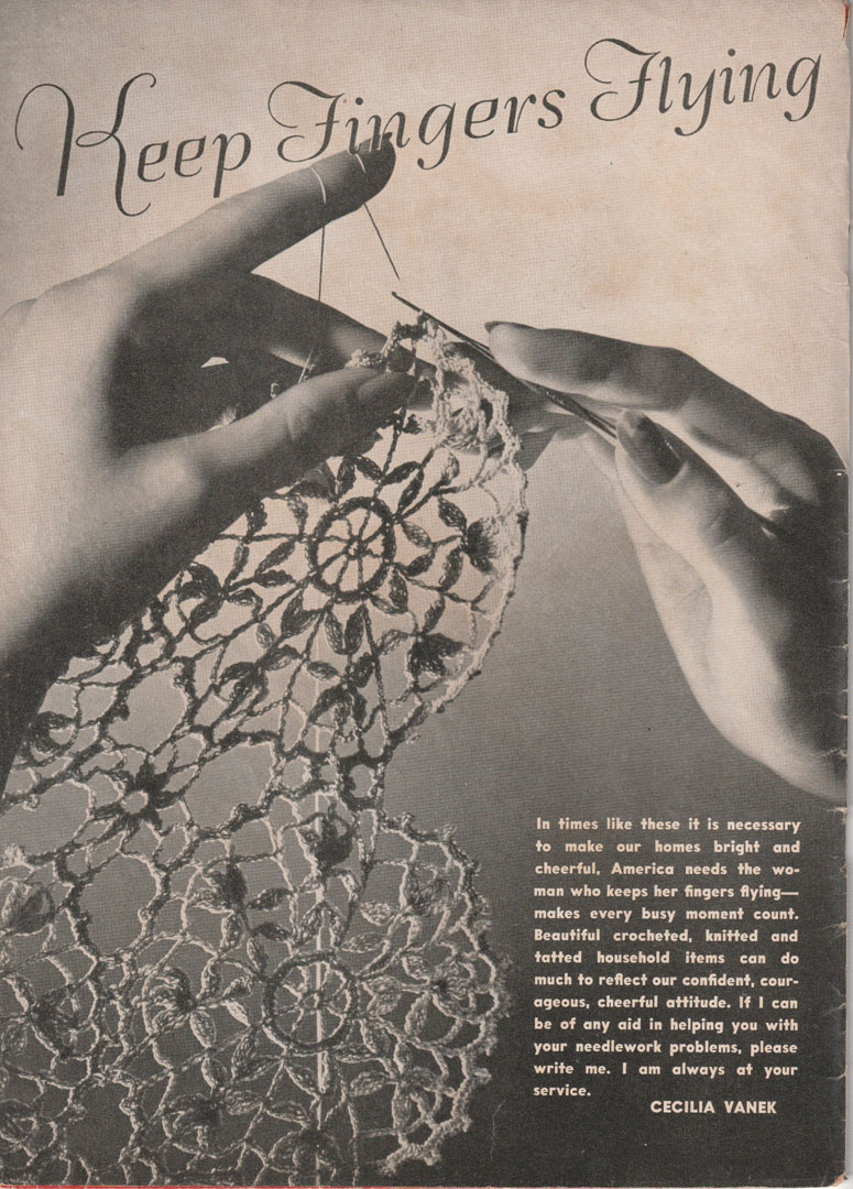 Needlework books in the early 1940s reflected the war.  The inside front cover of this Star Book for the home encouraged women to keep creating as usual — “In times like these it is necessary to make our homes bright and cheerful. American needs the woman who keeps her fingers flying — makes every moment count. Beautiful crocheted, knitted and tatted household items can do much to reflect our confident, courageous, and cheerful attitude.”