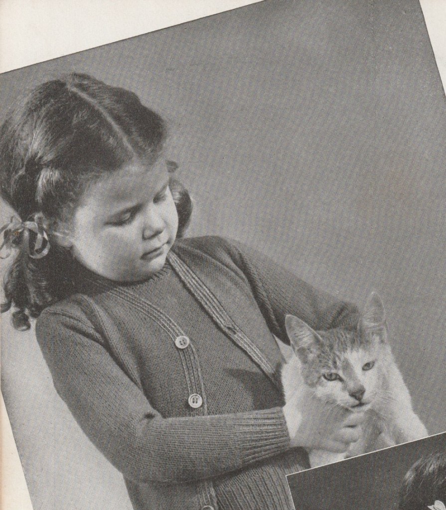 “Honey, I said PET the kitty, not SQUEEZE the kitty. ” 1941 sweater pattern from Beehive Yarns.