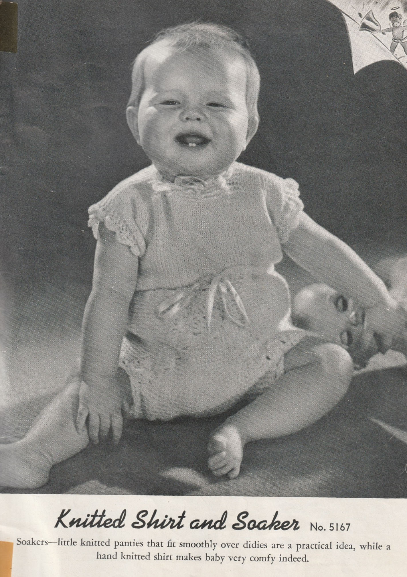 1942 soaker on a cute baby, with a slightly scary doll, from Chadwick’s Yarns.