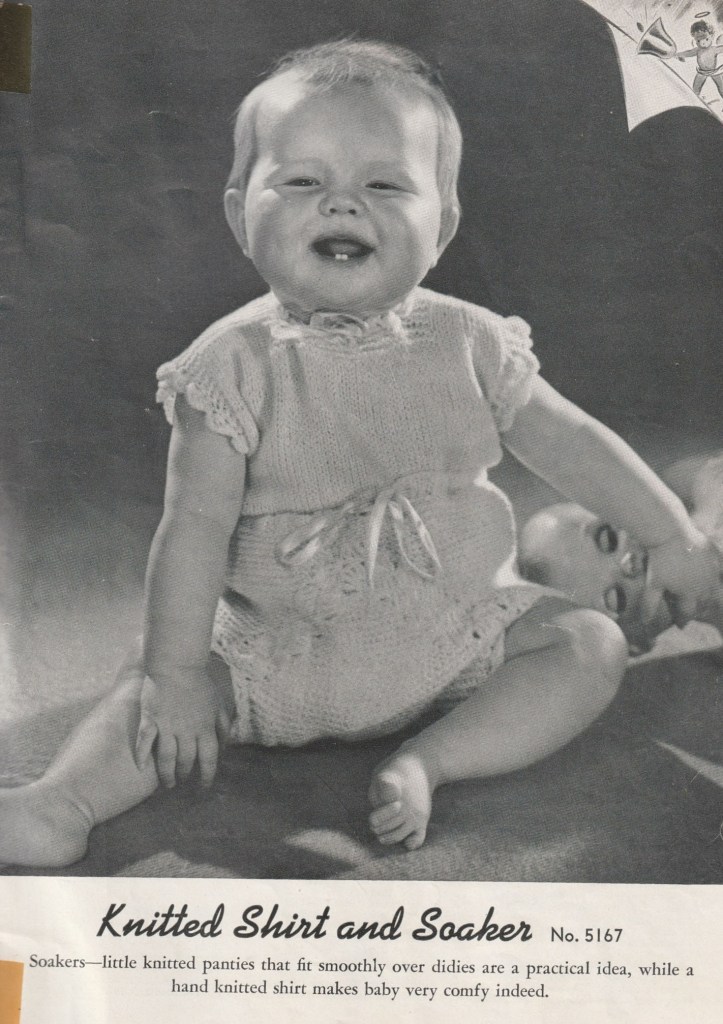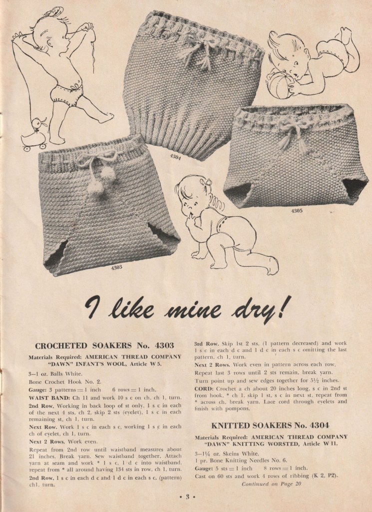 I had never heard of “soakers” but there were lots of patterns for them.  According to this timeline, rubber pants to cover diapers had been invented in 1910, but lots of people didn’t like to use them because they gave the babies rashes, and preferred to use these knitted diaper covers.