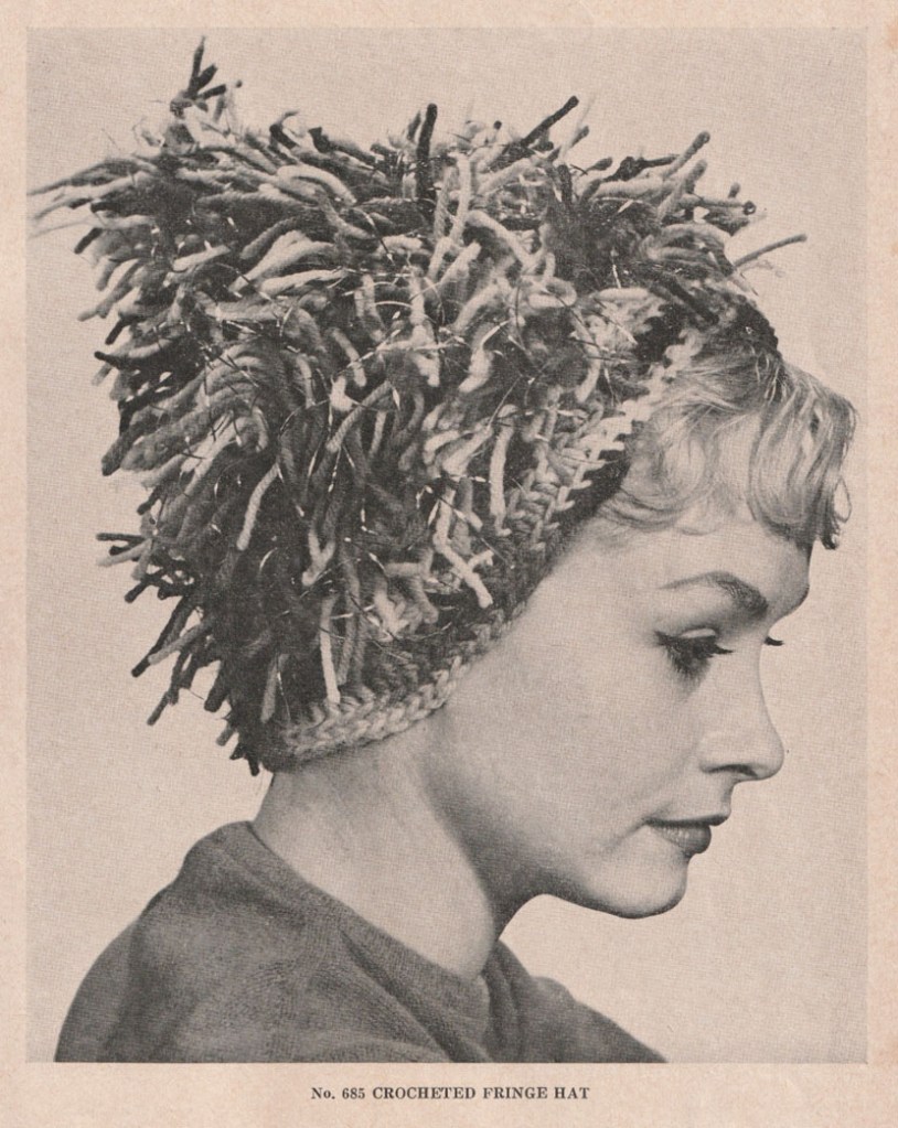 1961 Crocheted Fringe Hat, designed by Hilde Fuchs. As Joanna Mack commented on an earlier post, “they have gone a loop too far!”