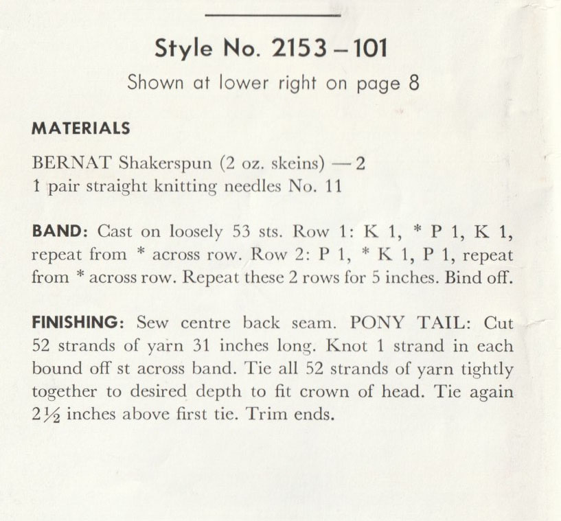 And then there’s this one, that requires only 53 stitches and 5 inches of knitting, and then completes the hat with lots of loose yarn tied into place.