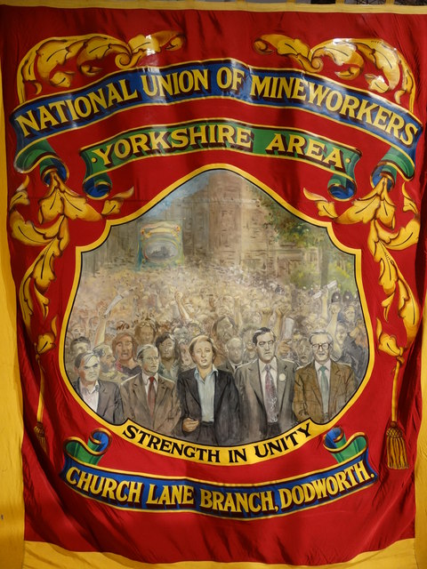 A banner such as Hunter describes in her book. NUM Banners Exhibition at Barnsley Civic Theatre (II) by Neil Theasby is licensed under CC-BY-SA 2.0