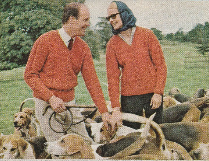 I always wear handknit sweaters when I run my foxhounds. 1965 Bernat ad from Vogue Knitting.
