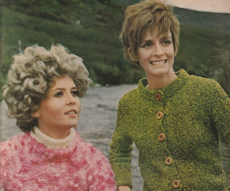 The model on the right is thinking, “Is this hair style going to ruin my modeling career?” Vogue Knitting, 1968.