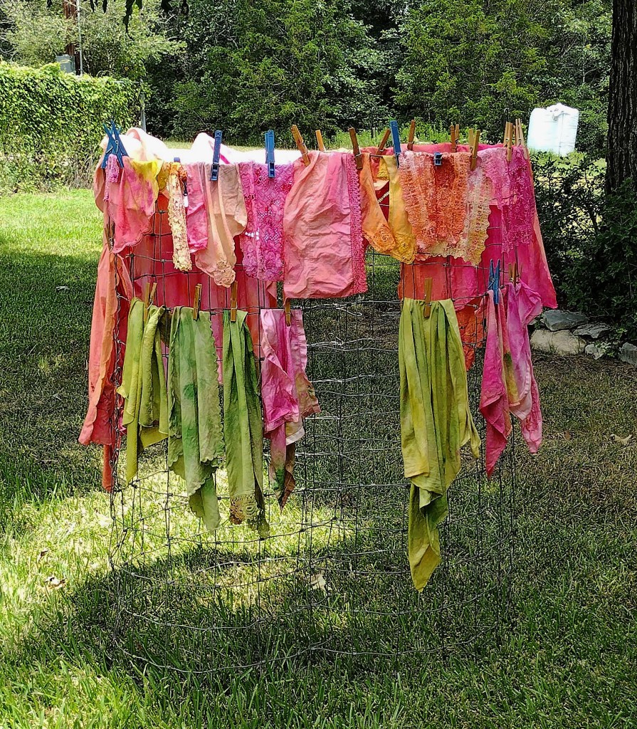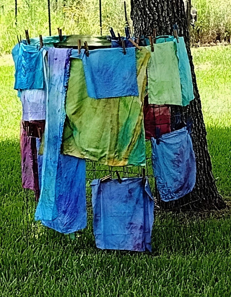 The second day I did another batch, this time with the cool colors. Learning from my previous day’s mistakes, I did lay some of them out flat to dry, and the ones I hung on the tomato cage, I stretched out as much as I could, to avoid those set-in wrinkles.