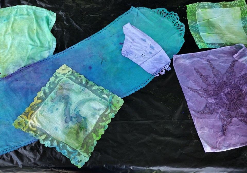 All of the fibers took the paints well. Some are more faded-looking, some are more intense, but I like the variety. I especially like how some nylon lace panels turned out.