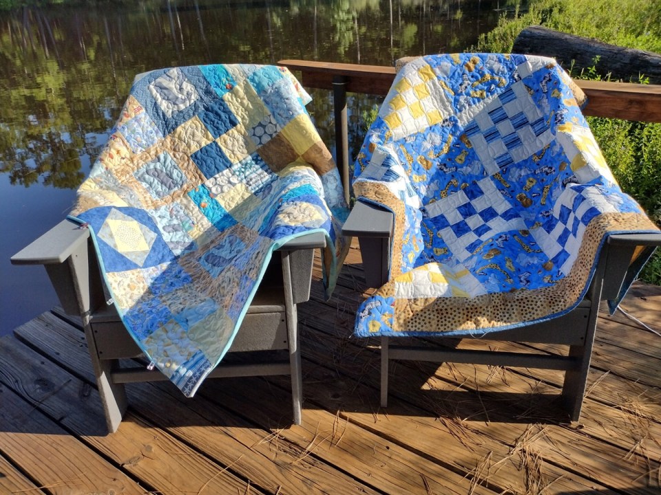 A few years ago, my older daughter brought me crates of quilting supplies that she had gotten through her Buy Nothing Facebook group in Austin. There was a group of scraps related to the beach and the sea, so I pulled some other fabrics and combined them into the quilt on the left. That is based on a quilt I saw on Pinterest that has since been removed.