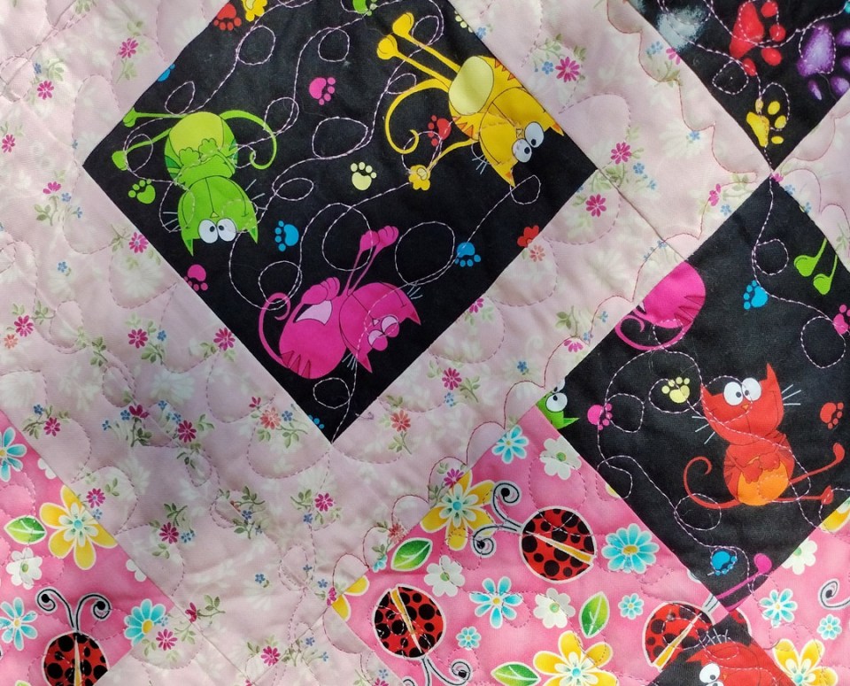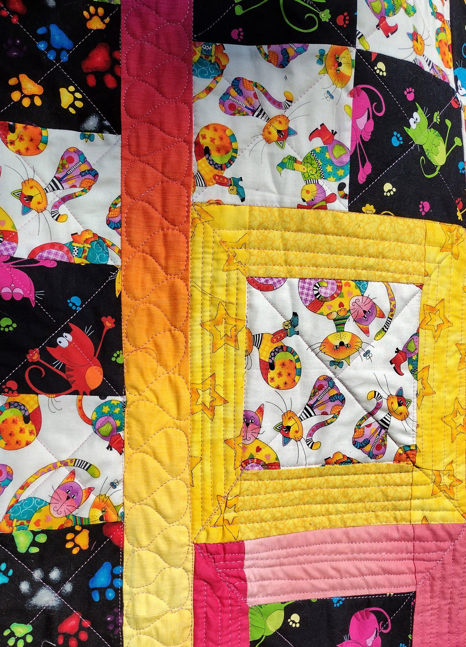 What beautiful quilts! I love the kitty fabric, and you used it so well. I’m very impressed with your free-motion quilting. And thank you for reminding me of Doreen.