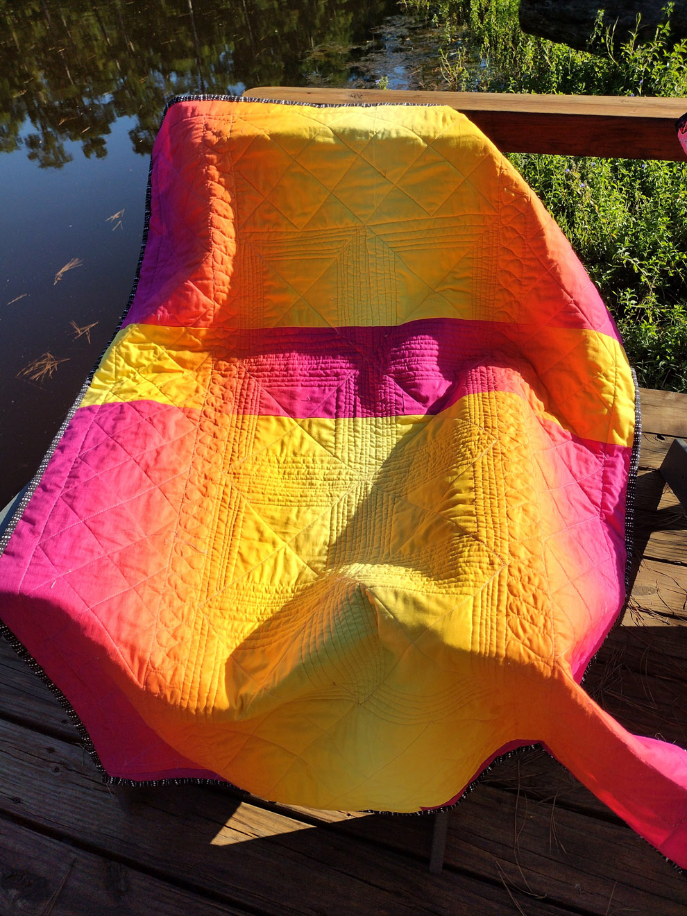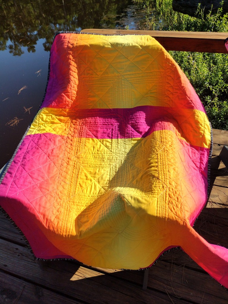 I had problems figuring out a good quilting pattern for the brighter quilt with the ombre sashing. I stayed with the lavender Glide thread, and did a combination of straight stitching and free motion. I just used the regular sewing foot for the straight stitch; the walking foot for this Juki has some light plastic for the top feed dog, and I can never get it to work to my liking. I like the results of the regular foot better. It’s not great but I think it will all crinkle up nicely when it is washed, and the irregularities won’t show.