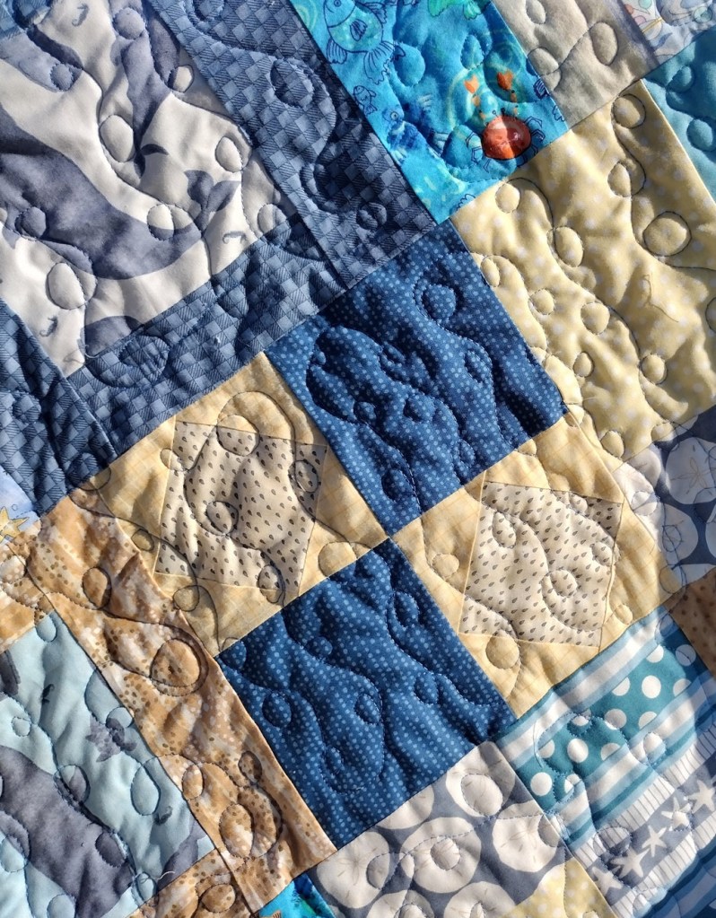 For that animal quilt, I did orange peel in the 25-patch blocks and loop-de-loop in the animal blocks, and for the beach quilt, I just did more free motion loop-de-loops. I still need to stitch the binding on that one and you can see clips in the pictures, but I was losing the light! 🙂