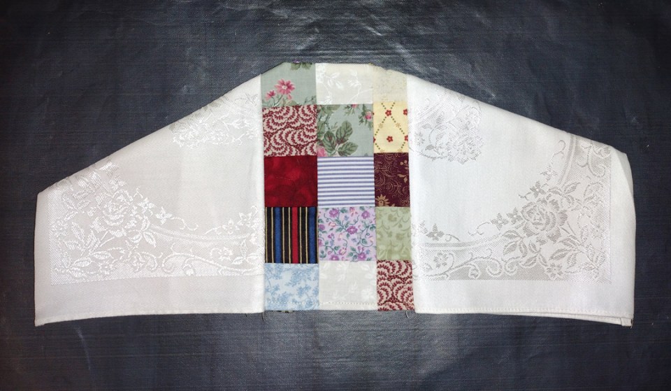 For smaller napkins, I cut them up the middle first and inserted some hemmed sections of pieced scraps. I also had some larger napkins that I had practiced free motion quilting on, and those worked great. (Linda’s tip was to make only one side quilted, because otherwise they can get way too bulky.)