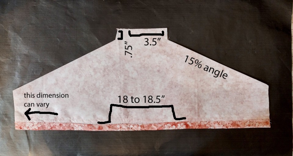 The basic pattern, with the measurements that worked well for me. Now that I look at it, this piece is not symmetrical, but this is a very forgiving project; I’m sure I trimmed it before sewing. 🙂