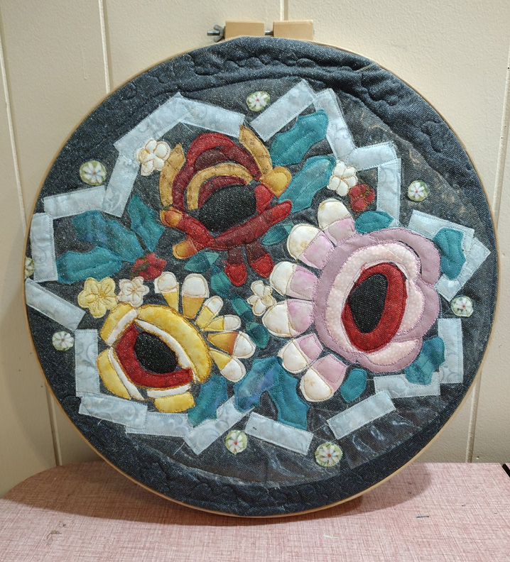 Mosaic, fused art quilt based on an antique brooch.