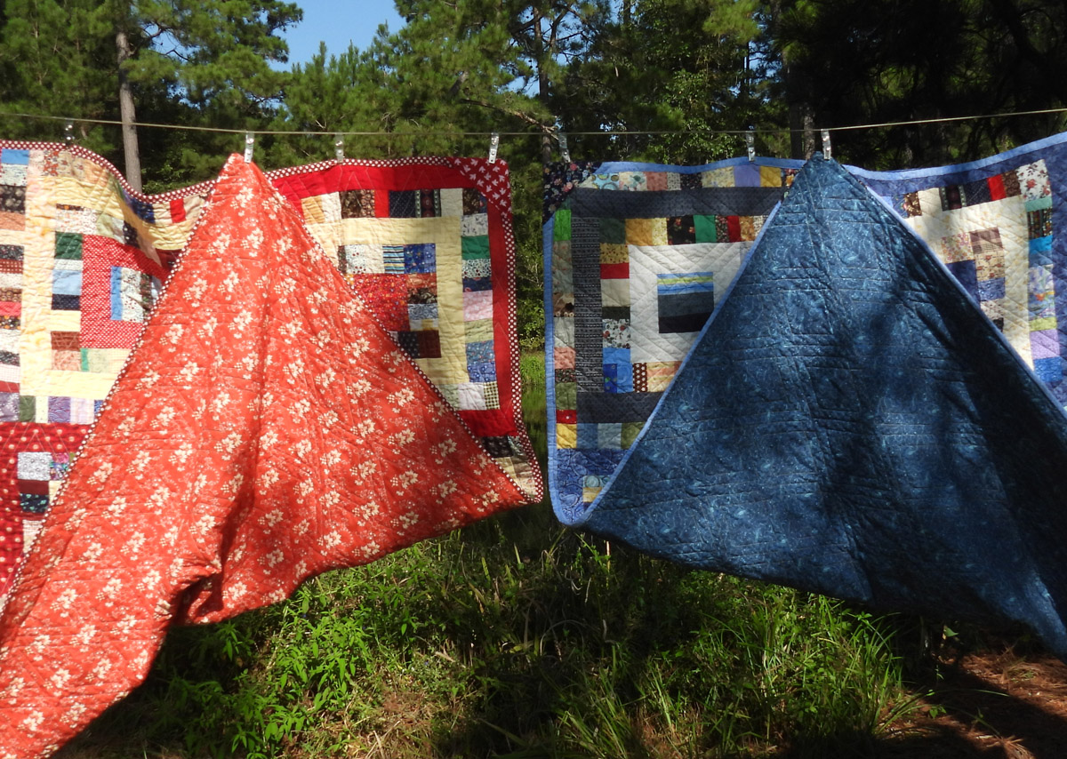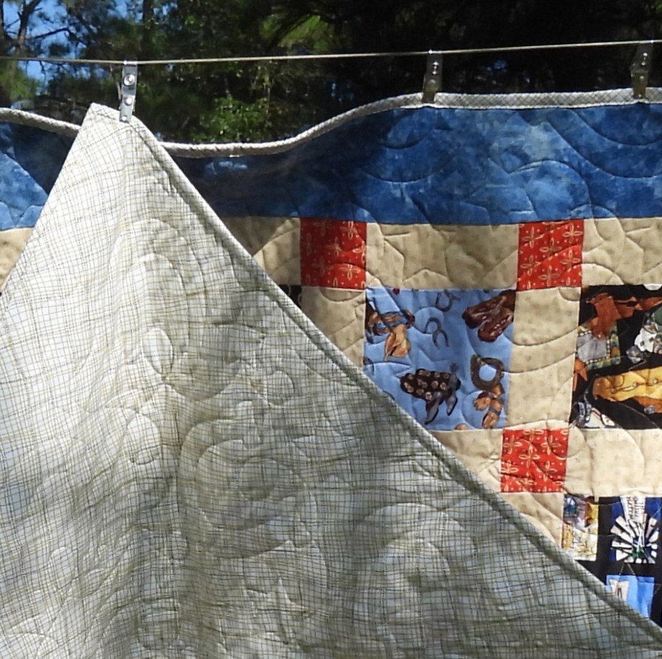 Backs of the String Theory quilts. Both quilted by Patti Roebuck.