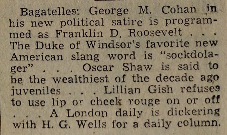 “The Duke of Windsor’s favorite new American slang word is ‘sockdolager‘.” I certainly never heard that word before, but I looked it up and it is an actual word, and I think it may be time to bring it back. 🙂