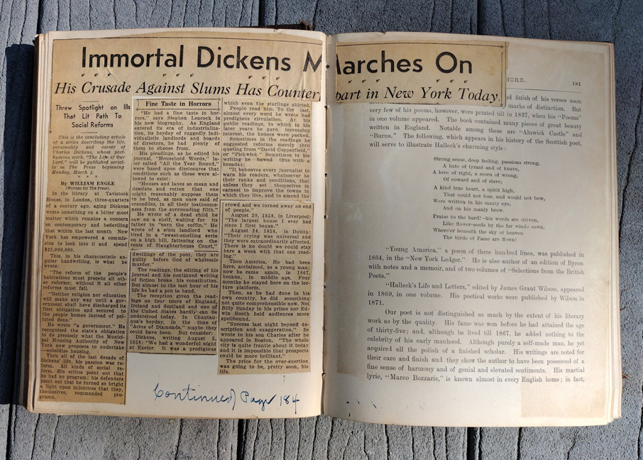 The saved articles are mostly about Dickens and Edison, but there are clippings about a stewardess with a broken leg, a very young child who could speak 3 languages, and a few “New York Day by Day” columns, one of which contained this gem: