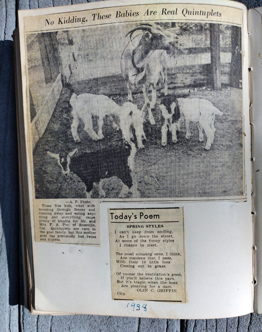 So all that would be interesting in itself, but even better, in the 1930s, someone decided that those blank pages were the perfect place to store newspaper clippings and typed poems– the sort of thing that in the early 2000s, my parents would have sent me in emails.