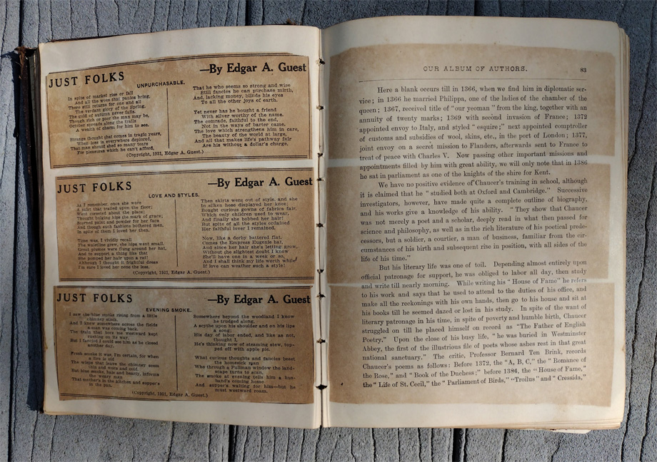 It must have been rather common to use actual books as scrapbooks. I have one that belonged to my great aunt. It is a thick book, an annual report of the Bureau of Indian Affairs, that my great aunt filled with newspaper clippings, poems, momentos, even feathers and four-leaf clovers, all glued to the pages.