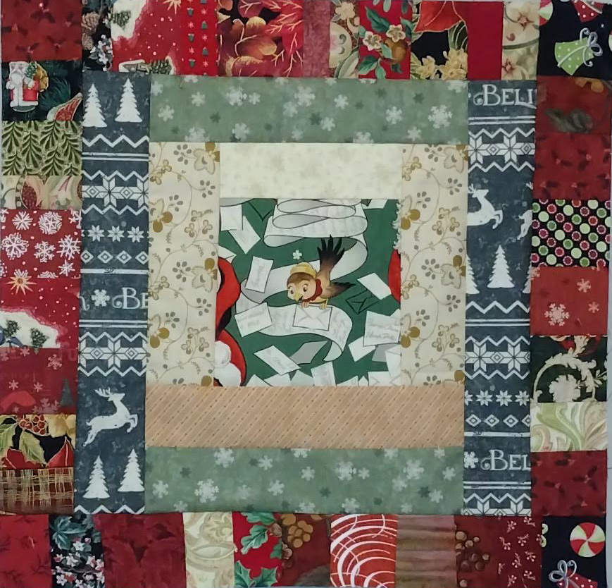 The highlighted fabric in these blocks comes from two Alexander Henry fabrics from about 2009 — Santa’s Sparrows and Letters to Santa. The pattern is based on Sharon Tucker’s String Theory pattern, which was in the April 2017 issue of American Patchwork and Quilting, and this will be the fourth quilt I have made from that design.