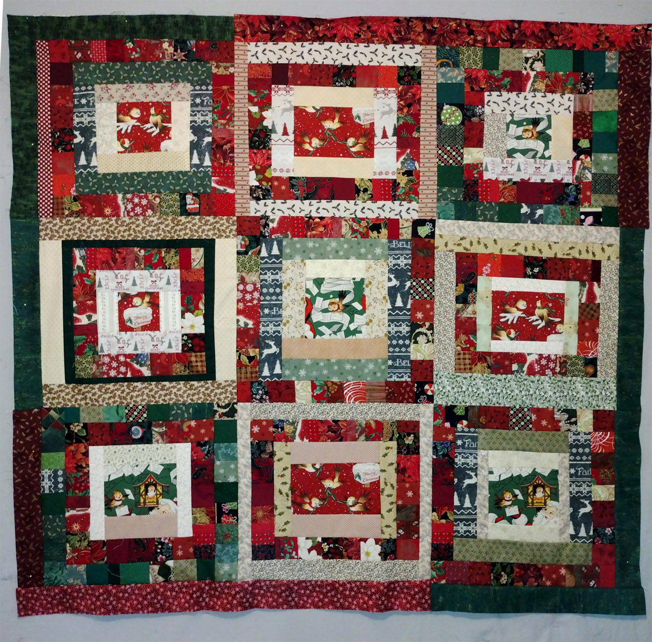 Blocks for a Christmas throw, as they were in December, on my gray design wall.