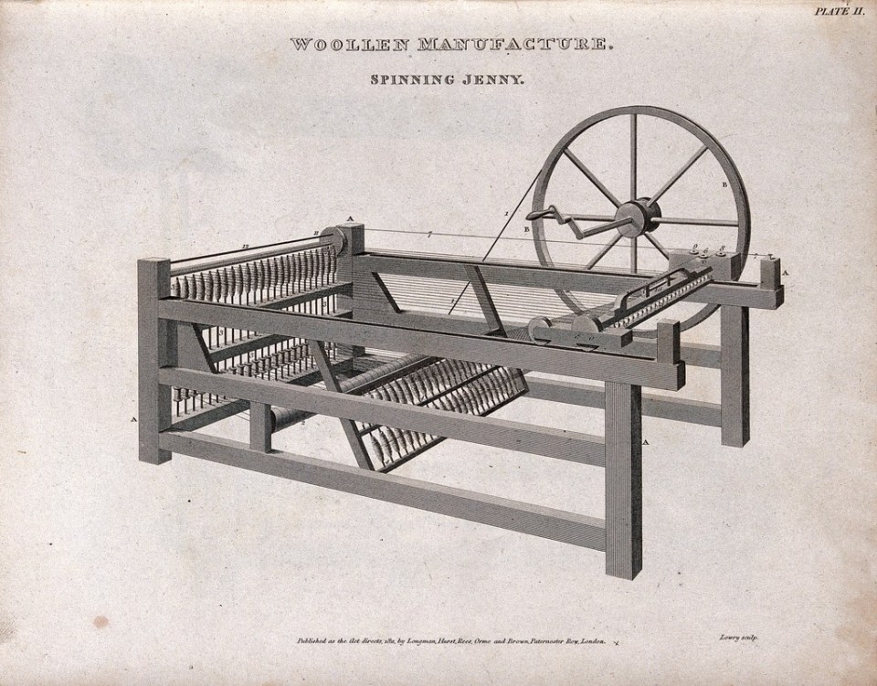 Credit: Textiles: a spinning jenny. Engraving by W. Lowry, 1811. Wellcome Collection. Source: Wellcome Collection.
