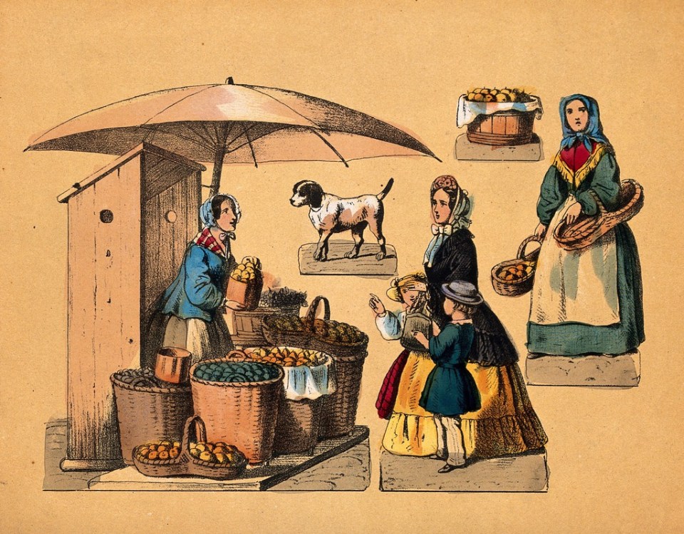 Credit: A woman is selling fruit from her market stall, set up under a large umbrella, to a woman who has two small children with her. Colour lithograph. Wellcome Collection. Source: Wellcome Collection.